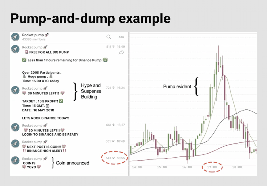 Being an unregulated market with a concentration of large amounts of cryptocurrency in few hands, crypto prices are especially sensitive to pump-and-dump schemes. The entire cycle can unfold in minutes, with prices doubling in 10-20 seconds and then crashing just as quickly.